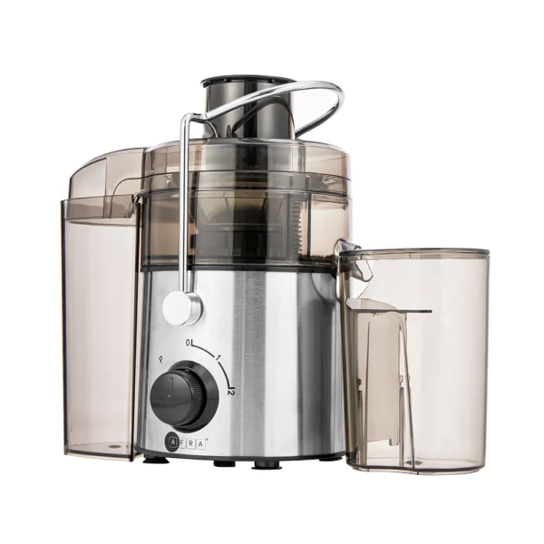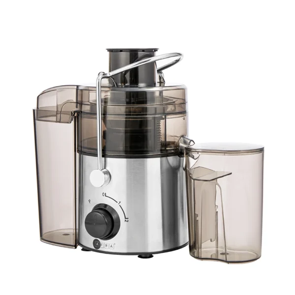 The AFRA Juicer is designed for powerful and efficient juicing. With a 400W motor and 2-speed settings (with pulse option), it quickly extracts juice from fruits and vegetables. The 60mm diameter tube allows for larger fruits to be juiced without the need for excessive preparation. The juicer features a 550ml juice jar and a 1000ml pulp cup, allowing you to make large batches of fresh juice. Made with durable ABS, AS, and PP materials, along with a stainless steel housing, it ensures long-lasting performance. The juicer comes with a BS plug, 1M power cord, and is easy to assemble and clean, making it an ideal appliance for any kitchen.
