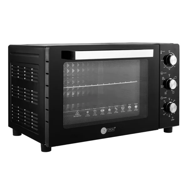 The AFRA Toaster Oven is a powerful and spacious appliance perfect for a variety of cooking tasks. With a 45L capacity and 1700W power, it provides ample space and strong performance for baking, roasting, and toasting. The oven’s temperature range is adjustable from 70°C to 230°C, offering flexibility for different recipes. The 120-minute timer with a bell ring helps ensure your food is cooked just right every time. Featuring multiple heating modes—off, upper heating, lower heating, and a combination of upper and lower heating—this oven can be used for a range of cooking styles. The double glass door ensures safe use and allows you to monitor your food while it cooks. The oven also comes with essential accessories including a bake tray, bake rack, and tray handle. Built with durable stainless steel heating elements, this toaster oven combines practicality with style for your kitchen.