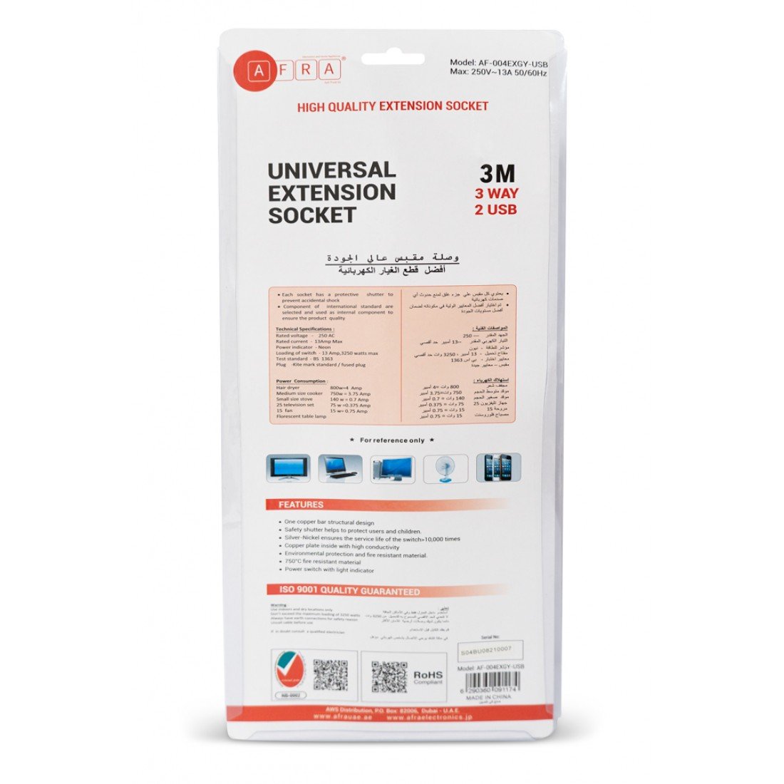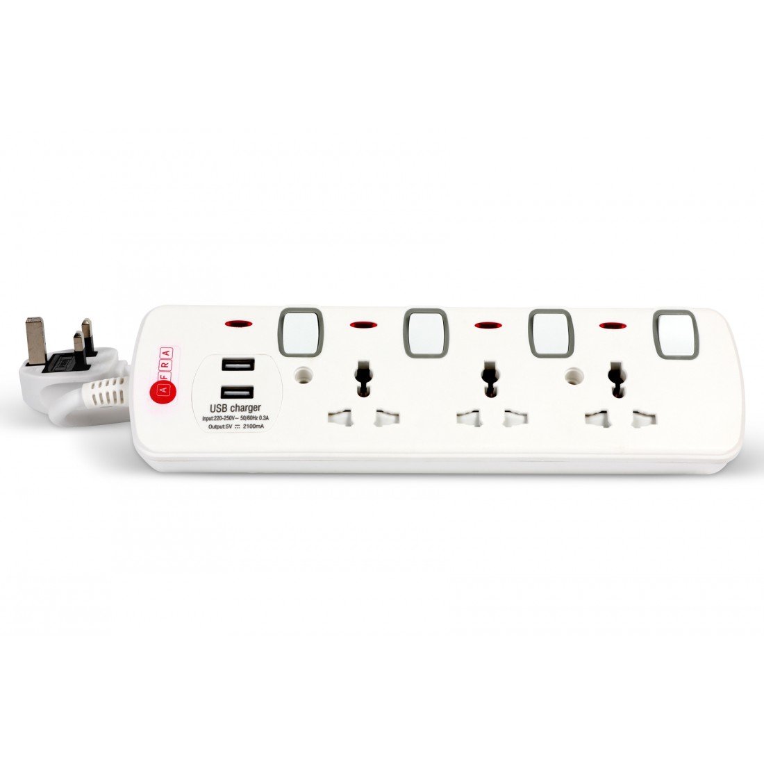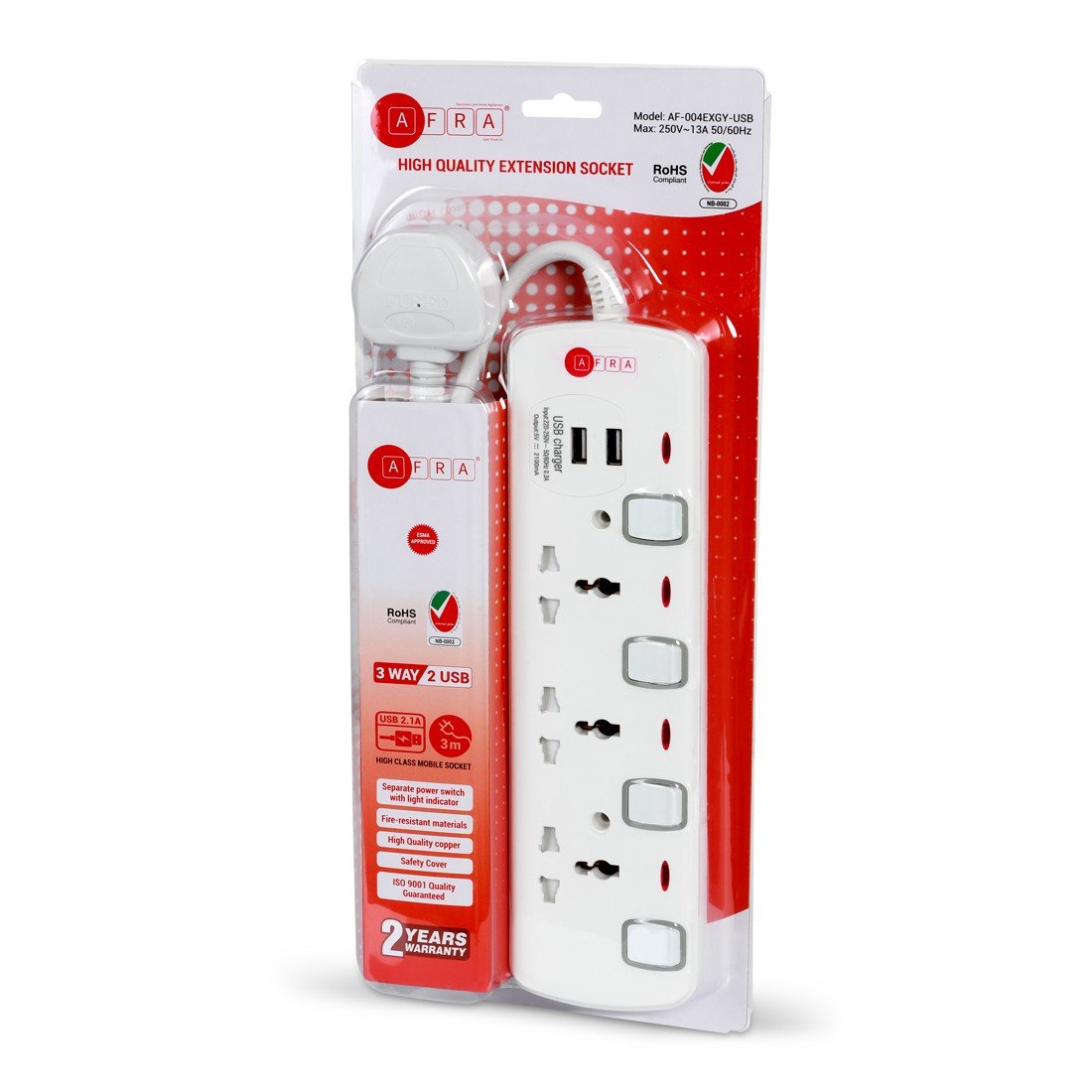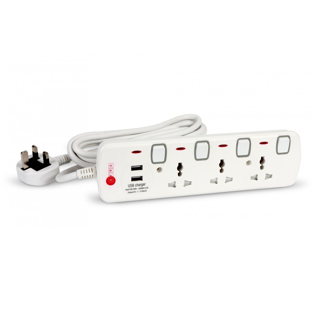 The AFRA Extension Cord AF-004EXGY-USB offers versatile power solutions with a 3-meter cable and 2 USB charging ports for simultaneous device charging. Designed with shock-proof plastic housing, it ensures maximum safety for home and office use. Compatible with standard 250V power supply, this extension cord is ideal for powering multiple devices while charging smartphones, tablets, and other USB-powered gadgets. Built for durability and reliability, it comes backed by a 2-year warranty for peace of mind.