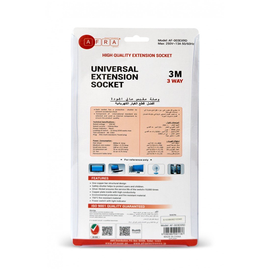 The AFRA Japan Universal Extension Cord (Model AF-003EXRD) is engineered for everyday performance and safety. Featuring 3 universal sockets and a 3-meter cable, it provides optimal power distribution for home, office, or workspace use. The shockproof design and 250V voltage rating ensure safe and efficient operation. Built with durable materials, this extension cord supports a wide range of plug types and electrical devices. Its compact build and easy setup make it perfect for organized and clutter-free environments. Backed by a 2-year warranty, AFRA guarantees long-lasting usability and peace of mind.