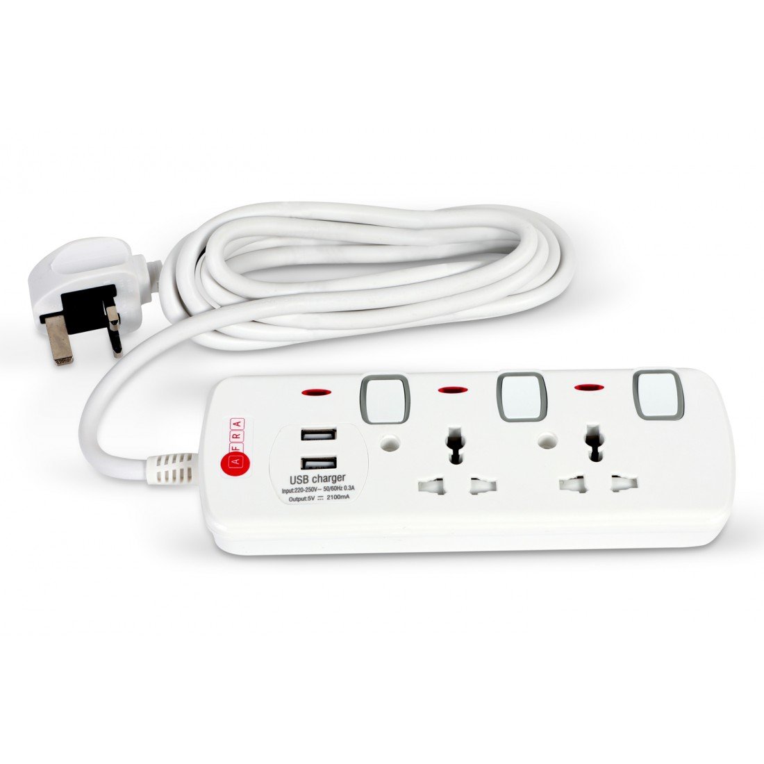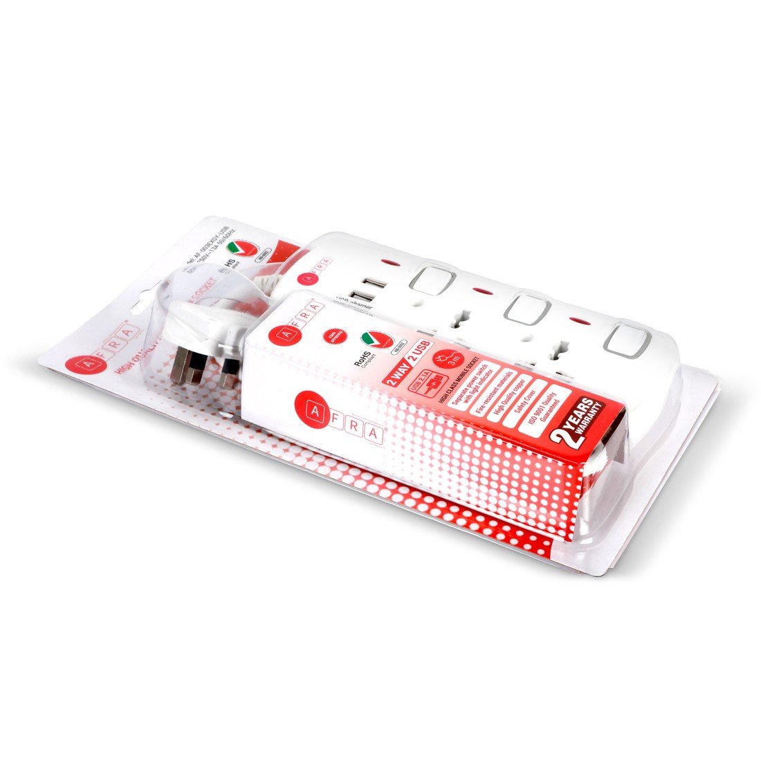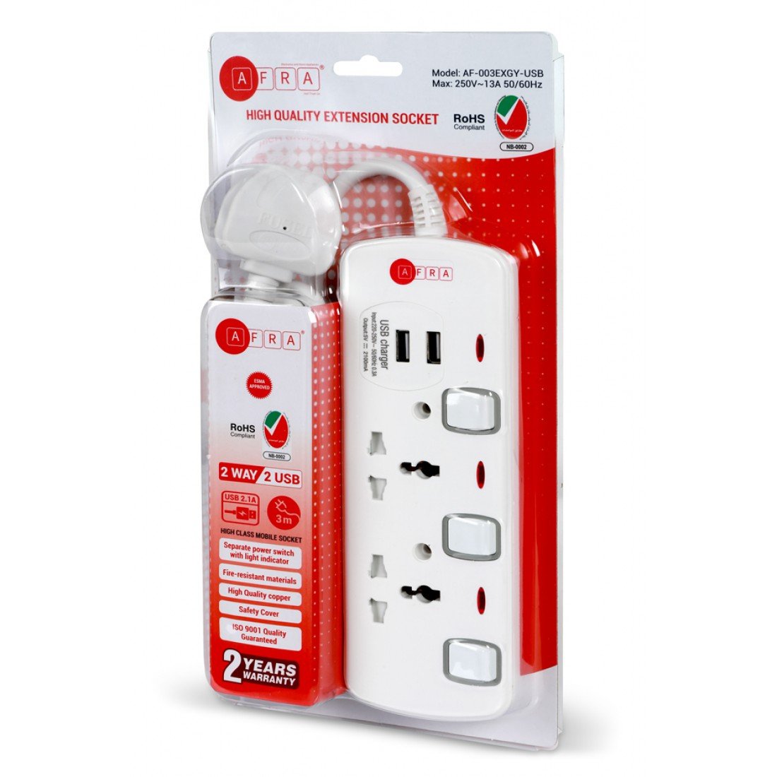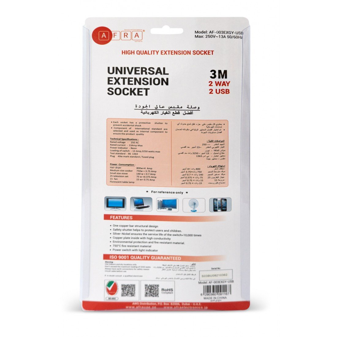 The AFRA Universal Extension Cord (Model AF-003EXGY-USB) delivers dependable power and charging in one compact unit. Featuring 2 universal sockets and 2 integrated USB ports, it allows you to plug in multiple appliances and charge your mobile devices simultaneously. The 3-meter cable gives extended reach, while the shock-proof plastic housing ensures safe usage in any environment. With a 250V rating and durable build, this extension cord is ideal for home, office, or travel setups. Compact, efficient, and backed by a 2-year warranty, it’s the smart solution for daily power needs.