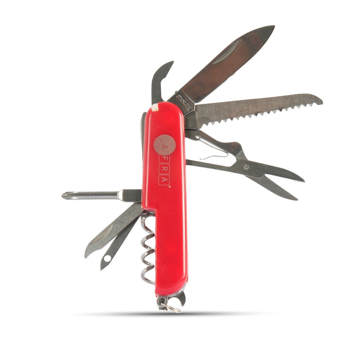 AFRA Multifunction Knife – Model AF003MK is a durable and compact 9-in-1 tool made for adventurers, DIYers, and daily users. Constructed with high-quality 3CR13 stainless steel and covered in a sturdy red ABS grip, it combines strength, utility, and comfort in one sleek design.