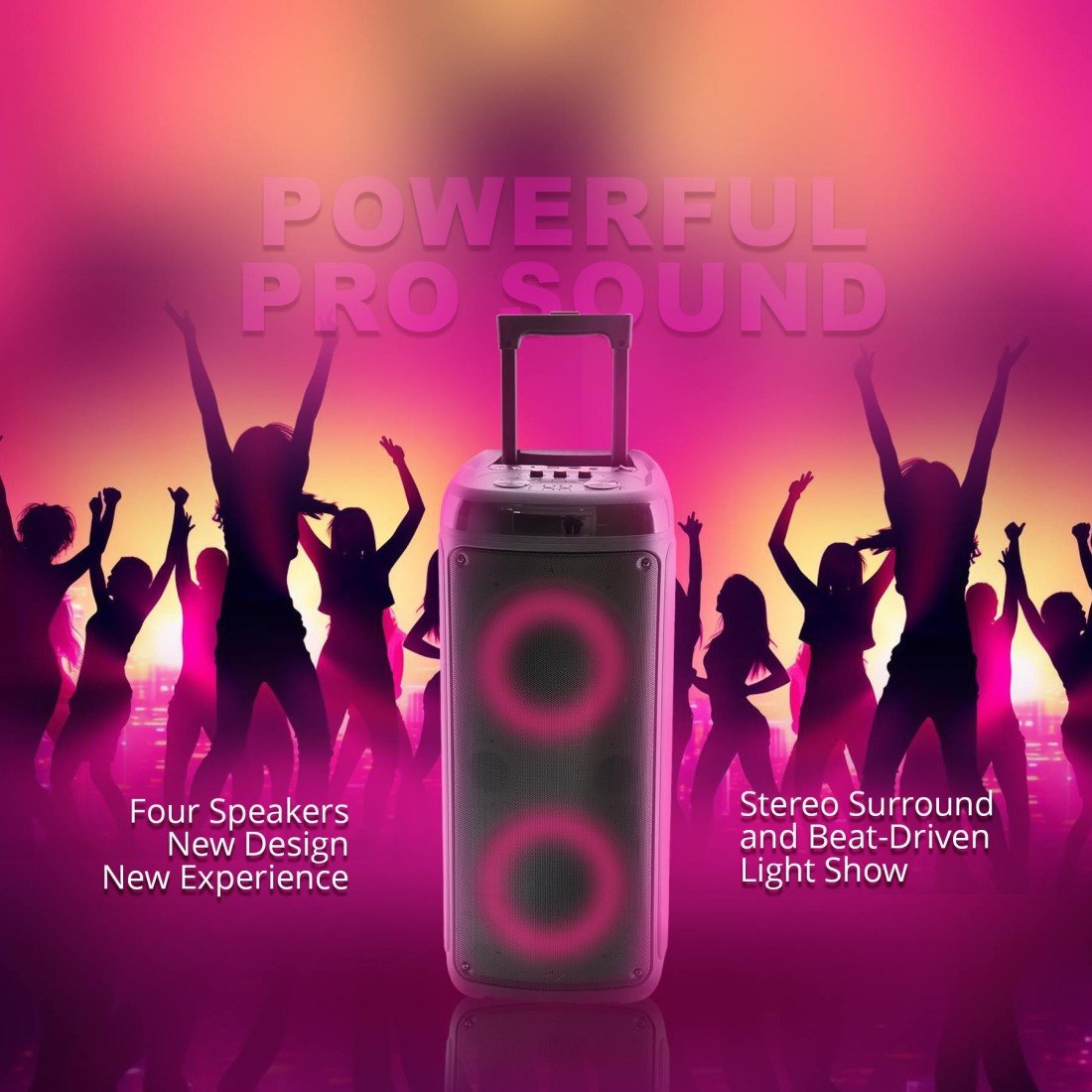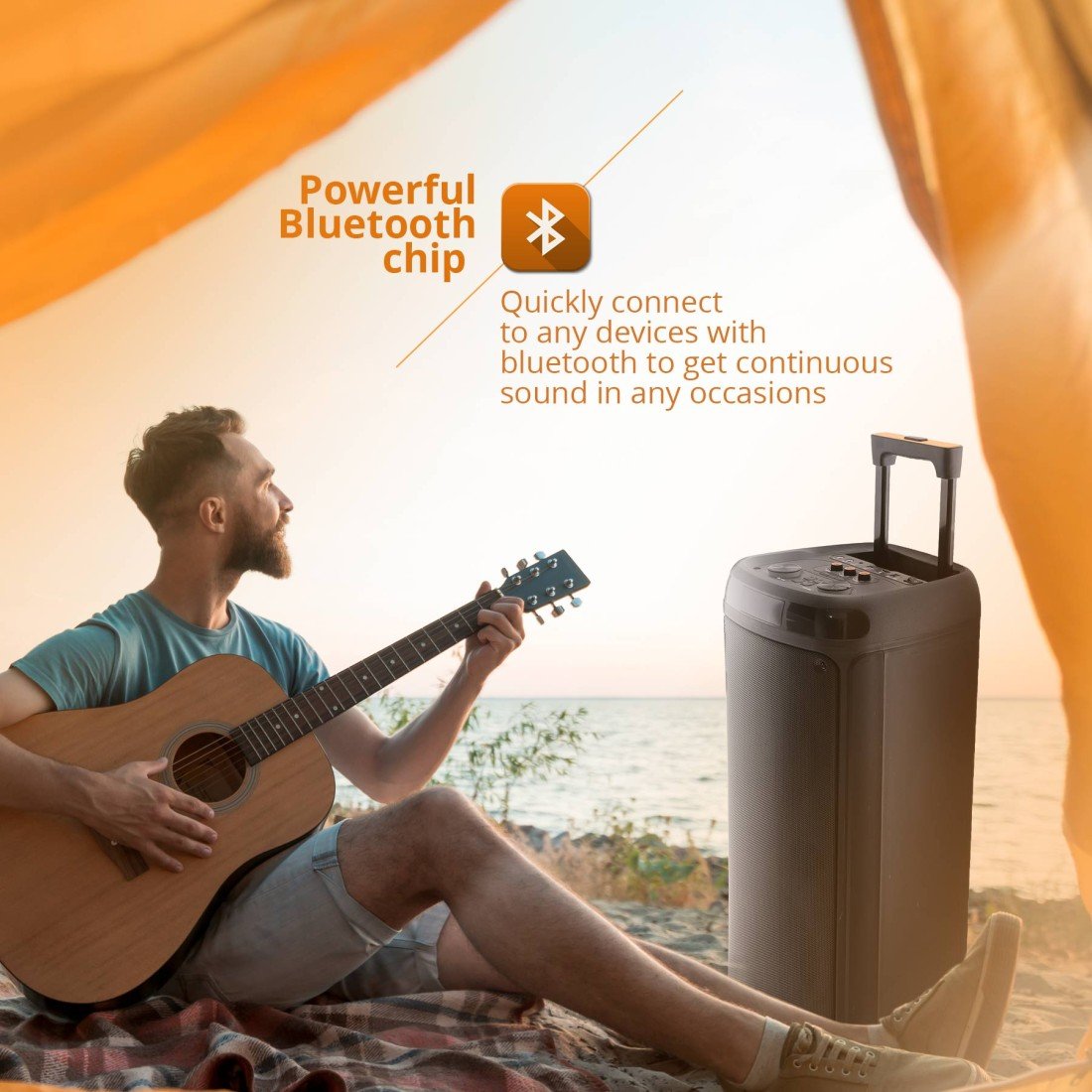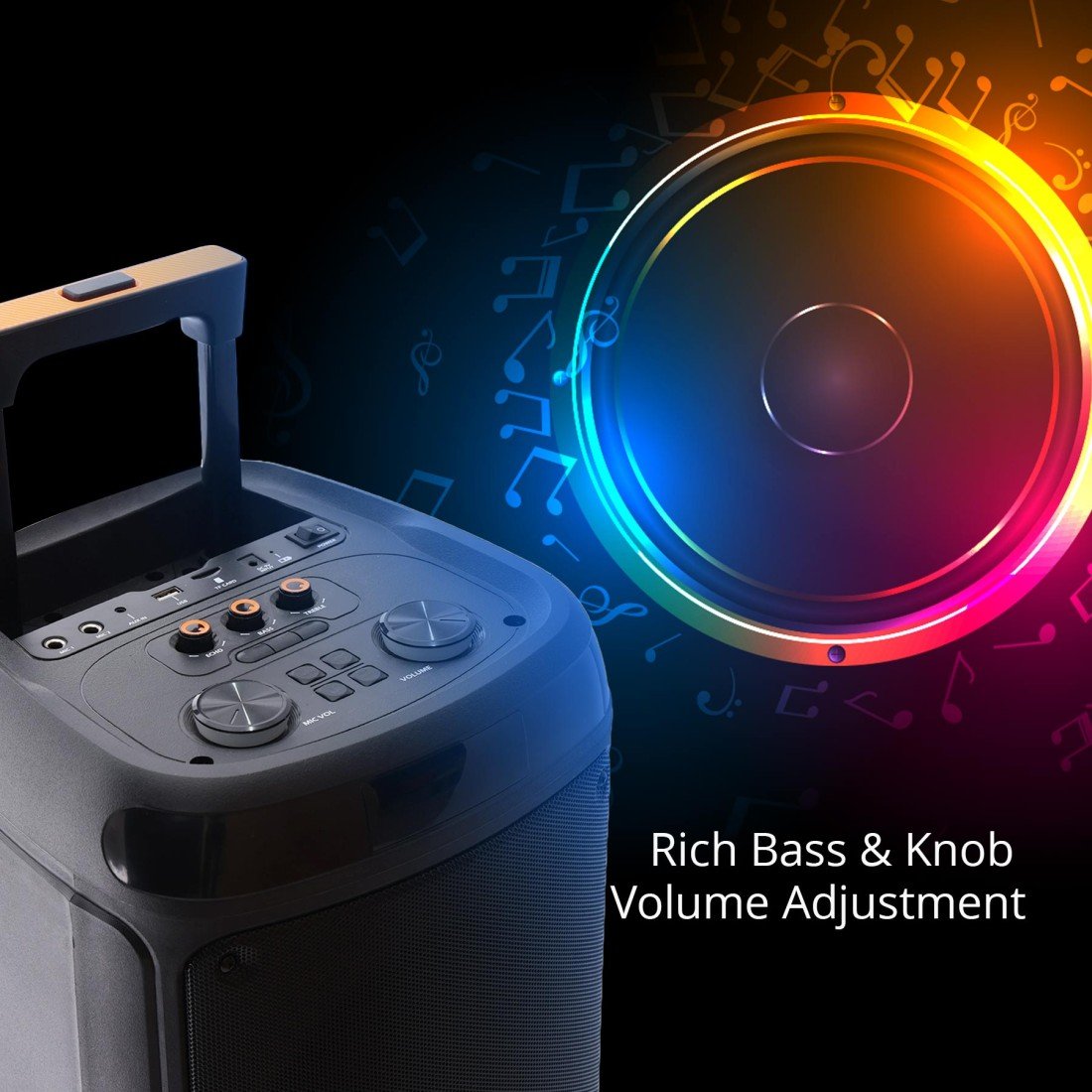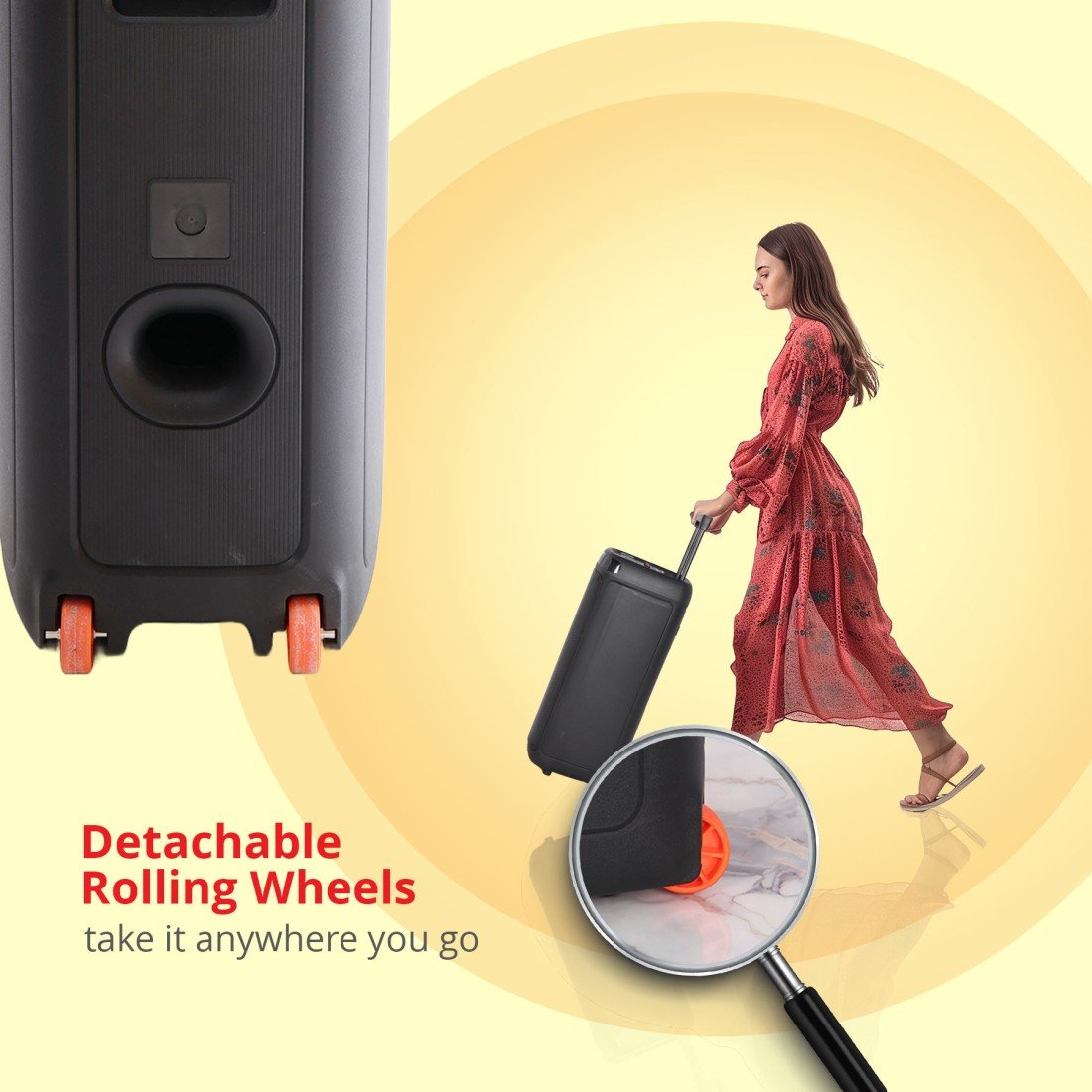 Weighing just 6.5kg, it offers convenient mobility with a durable black body and built-in trolley handle. The 4000mAh rechargeable battery ensures extended playtime on the go. Enjoy seamless audio with True Wireless Stereo (TWS) technology, allowing you to connect multiple speakers for an immersive soundstage. Backed by a 2-year warranty, the AFRA trolley speaker combines power, portability, and premium features for all your audio needs.