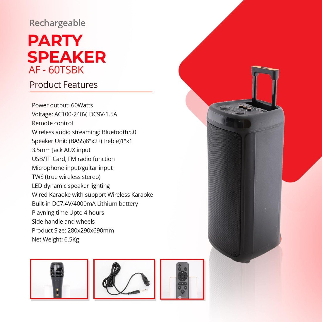 Elevate your audio experience with the powerful AFRA Trolley Speaker (Model: AF-60TSBK). Delivering 60 watts of clear, rich sound through dual speakers, this portable trolley speaker is perfect for parties, events, and outdoor gatherings.