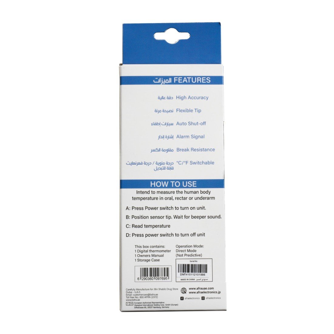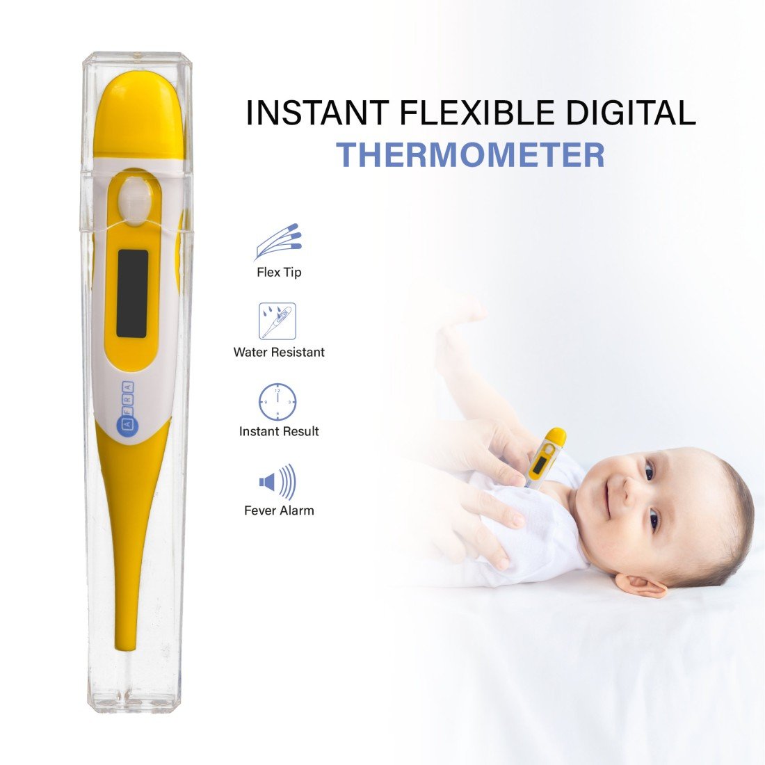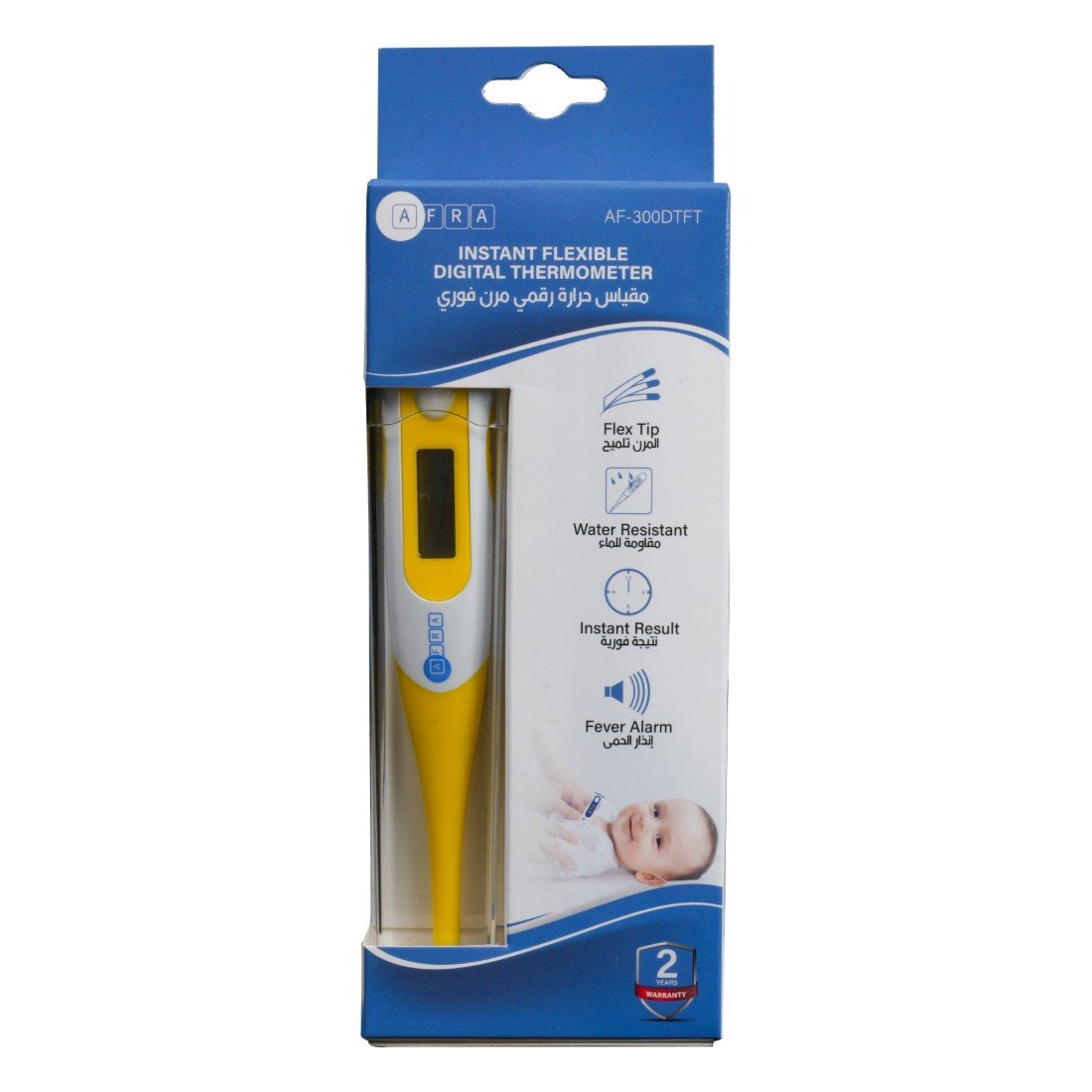 The AFRA Instant Flexible Digital Thermometer AF-300DTFT delivers fast, accurate temperature readings in just seconds. Designed with a flexible soft tip for safety and comfort, especially for infants and children, this thermometer is ideal for oral, rectal, or underarm use. The sleek white body ensures a clean and hygienic feel, while the digital display provides easy-to-read results. Compact and portable, this essential health tool is perfect for home or travel use. Backed by a 2-year warranty, it combines reliability, comfort, and ease of use for the whole family.