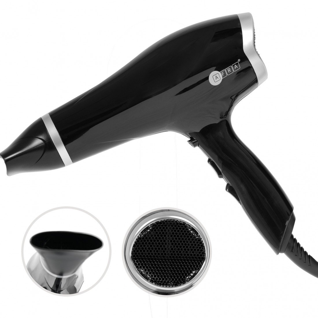 Style your hair effortlessly and professionally with the AFRA Hair Dryer – Model AF-2300HDBK. This powerful DC motor dryer offers 2300W of drying power for fast, salon-quality results from the comfort of your home.Equipped with 2 speed levels and 3 heat settings, it allows customizable control for all hair types. The cool shot function helps to lock in your hairstyle, while the ionic technology reduces frizz, enhances shine, and protects hair from heat damage.The concentrator nozzle focuses airflow for precise styling, and the removable filter ensures easy cleaning and long-lasting performance. Designed for both performance and convenience, this dryer is perfect for home or professional use and backed by a 2-year warranty.