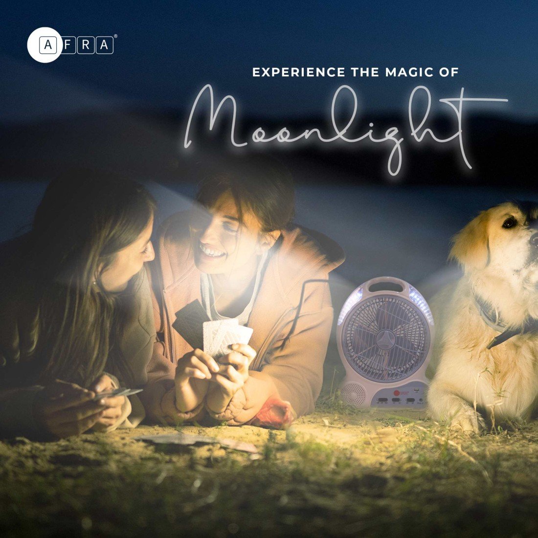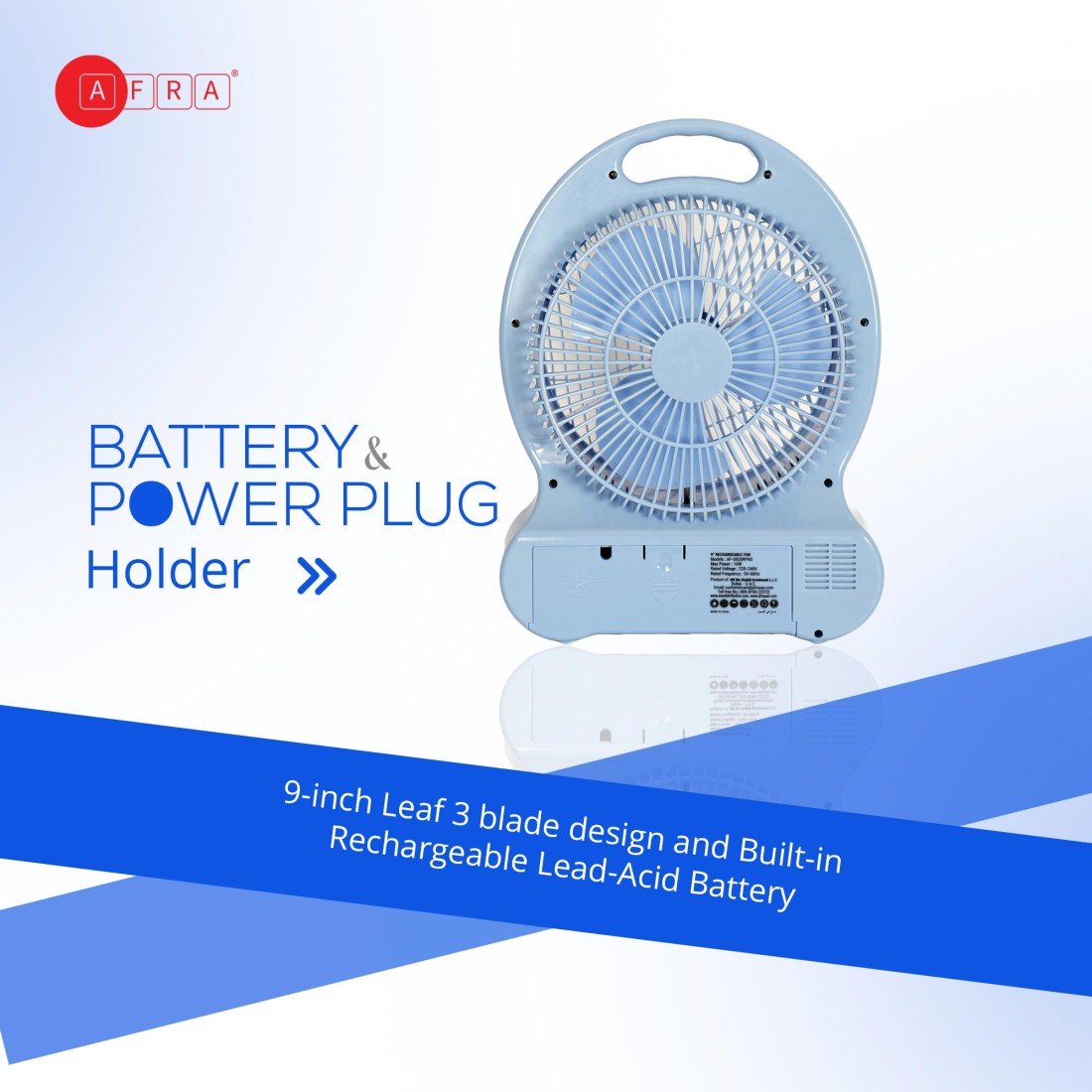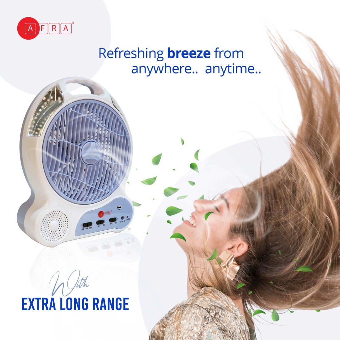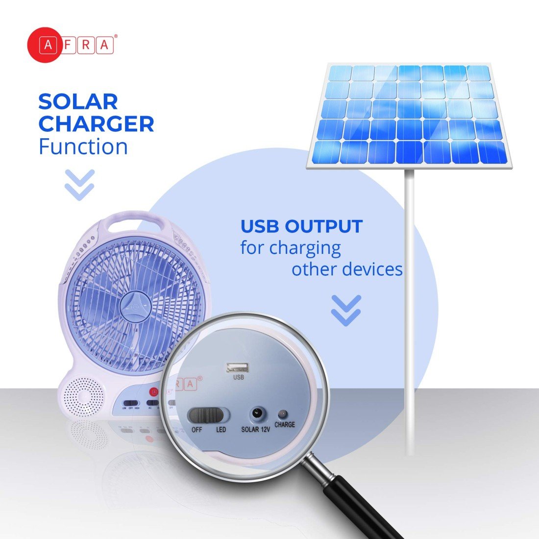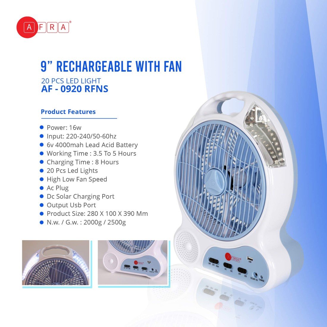 AFRA Rechargeable 16W LED Fan, White, Solar Charging Port, Plastic Body – AF-0920RFNS, 2-Year Warranty
