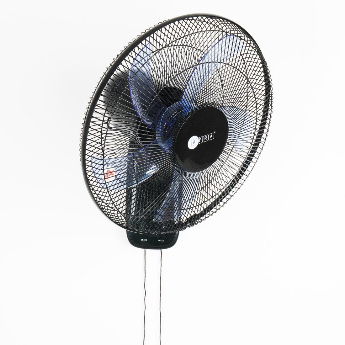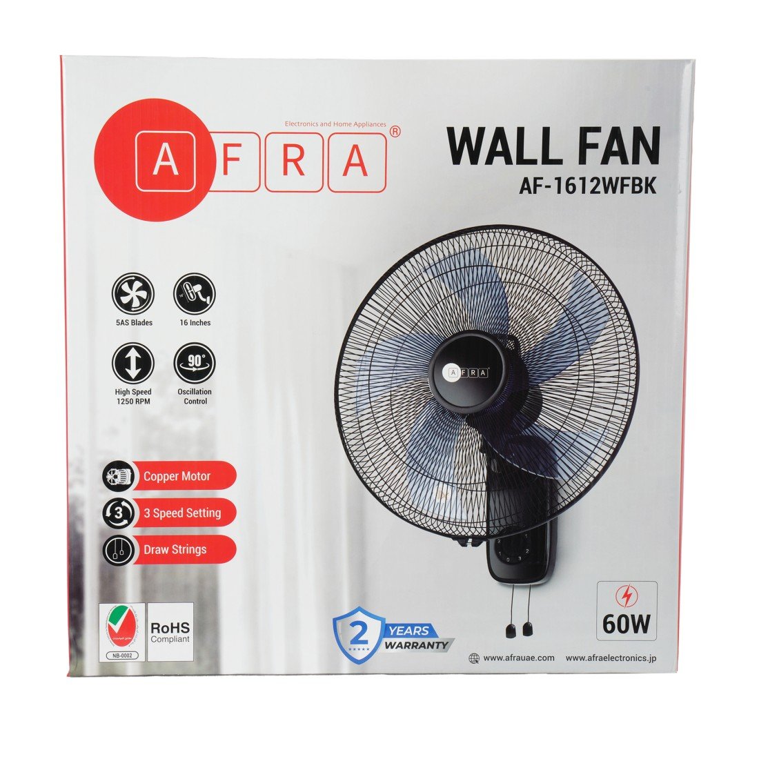 Stay cool and comfortable with the AFRA 16-Inch Wall Mount Fan – Model AF-1612WFBK. Equipped with a powerful 60W motor and running at 1250 RPM, this fan provides efficient airflow with a flow rate of 5.5 m³/min. Its 90-degree oscillation feature ensures wide air distribution, cooling your room evenly.The fan offers 3 adjustable speed settings so you can customize the airflow to your preference. Finished in sleek black, it fits perfectly in any home or office environment. Designed for easy wall mounting, this fan saves floor space while delivering powerful, quiet cooling. Backed by a 2-year warranty, it guarantees lasting performance and peace of mind.