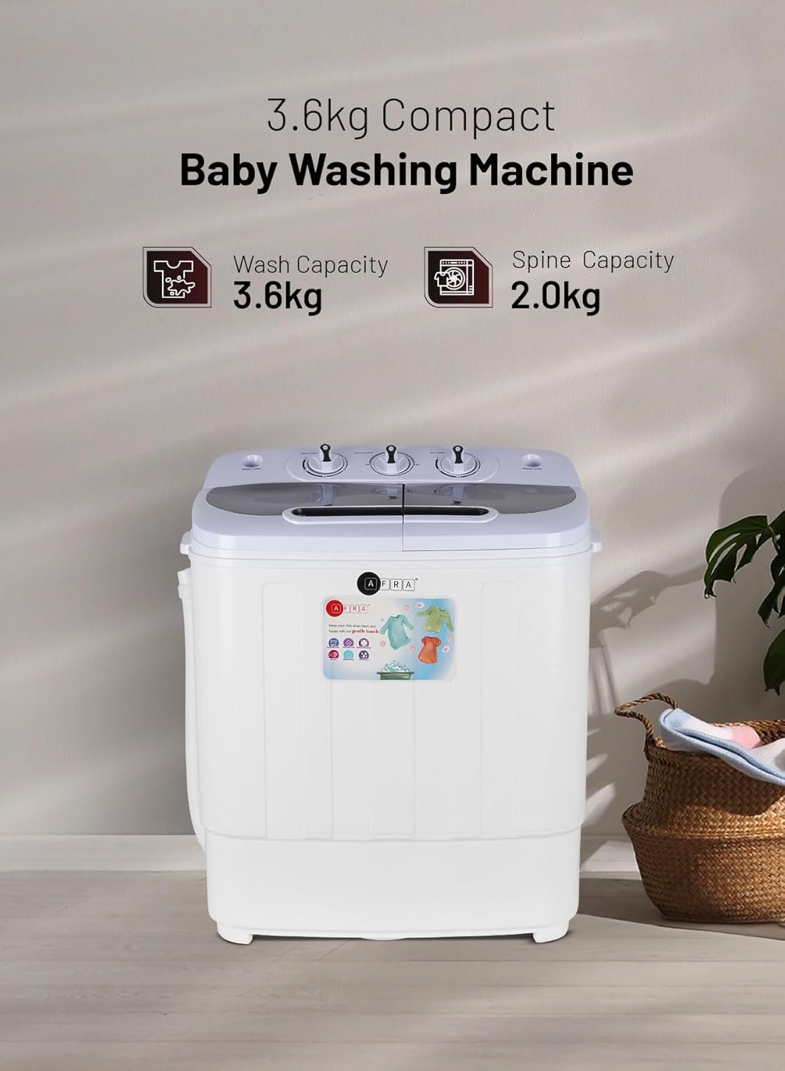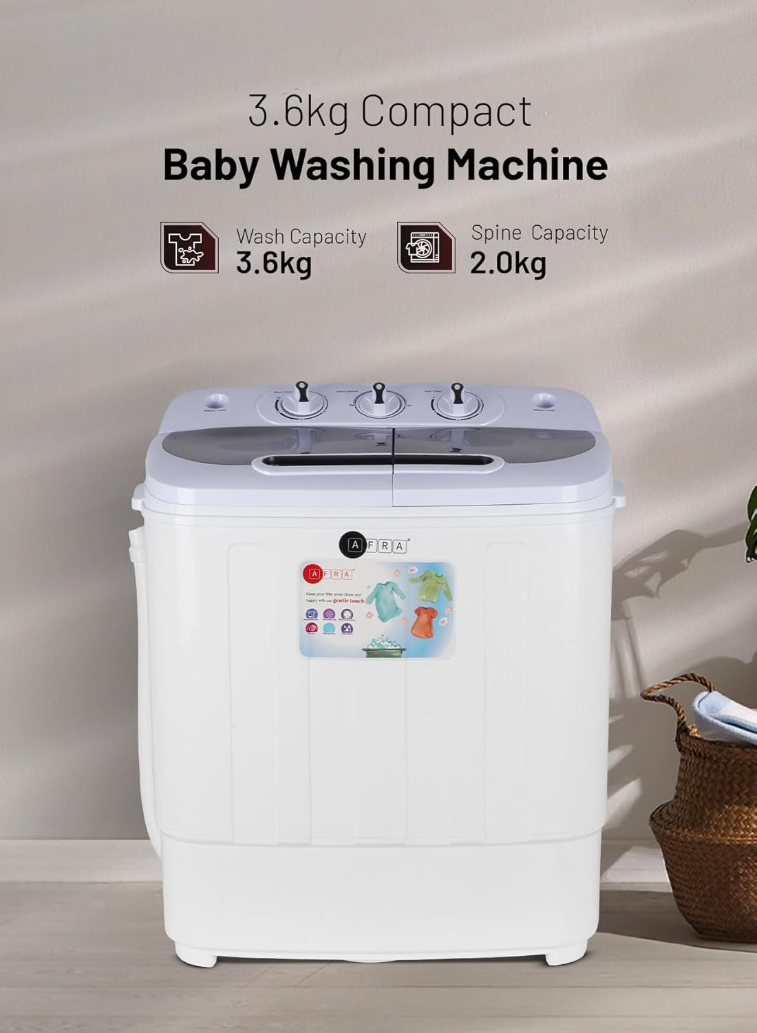 AFRA Baby Washing Machine AF-3624BWTT is a smart, compact solution designed specifically for washing baby clothes and light laundry loads. With a 3.6kg capacity, this portable washing machine is ideal for apartments, dorms, and homes with limited space. It features elution separation technology that ensures better wash quality by effectively removing detergent residues. Its built-in spin and dry function allows faster drying, while the non-slip foot pads provide added safety during operation. Operating on 220-240V at 50-60Hz, this energy-efficient model is perfect for daily convenience. Comes with a 1-year warranty for peace of mind and long-term use.