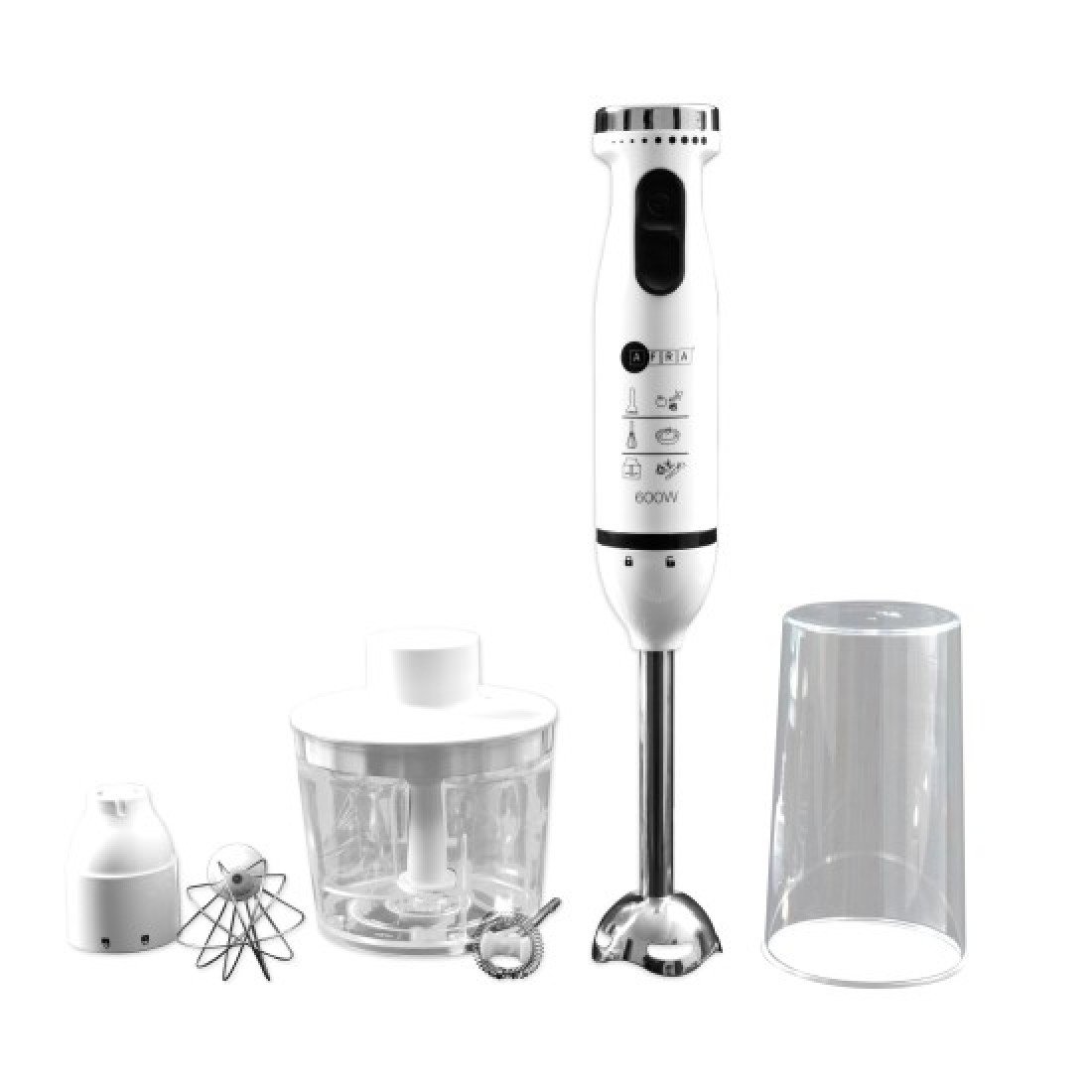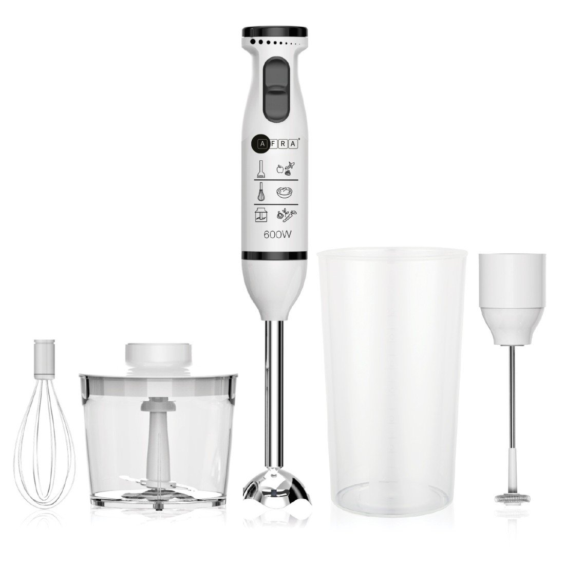 The set includes a chopper, whisk, and mixing cup, making it ideal for smoothies, sauces, baby food, batters, and more. Crafted with stainless steel components, it offers long-lasting quality and easy maintenance. The AFRA hand blender ensures high safety and environmental standards.
