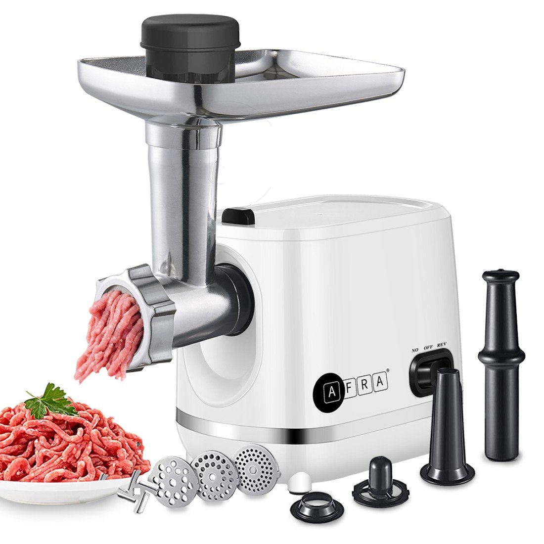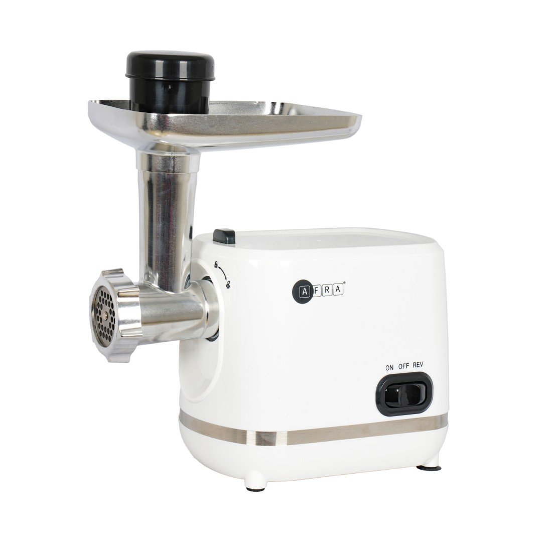 The AFRA Meat Grinder – Model AF-1200MGWT is your reliable partner for fast and efficient meat preparation at home. Powered by a durable 1200W motor, it delivers superior grinding performance while maintaining compact functionality.This meat grinder comes with 3 stainless steel cutting discs (coarse, medium, fine), perfect for various types of meat textures. The stainless steel cross knife ensures clean, sharp cuts every time. Its aluminum body construction enhances durability while keeping it lightweight and easy to manage.Equipped with a food pusher, as well as kibbeh and sausage attachments, it’s designed for multi-functional use—ideal for preparing traditional recipes from scratch. The AF-1200MGWT ensures safety and top-quality performance. Enjoy peace of mind with its 2-year warranty.