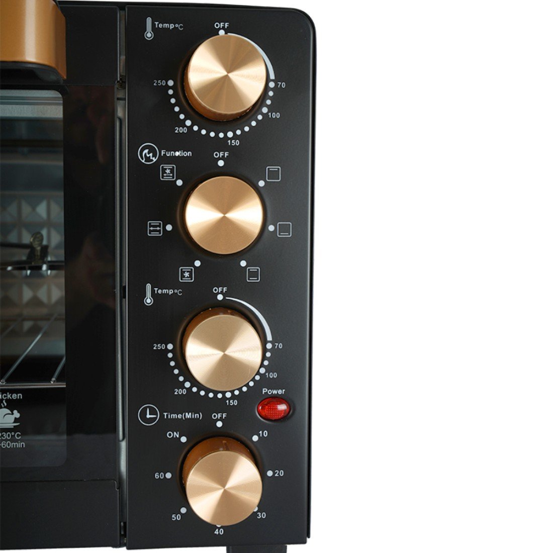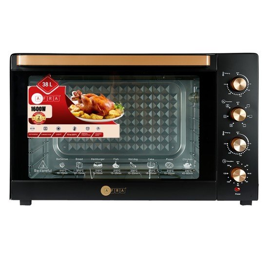 Upgrade your kitchen with the powerful and spacious AFRA Electric Oven Toaster – Model AF-3816OTBK. Designed with a large 38-liter capacity and a 1600W heating system, this premium toaster oven makes cooking faster and more efficient for large families and gatherings.It features 7 multifunction cooking options, including rotisserie, convection, bake, broil, and toast, allowing you to prepare a wide variety of dishes. The adjustable thermostat (70°C to 250°C) offers complete control for precise cooking and baking. With its built-in oven lamp, you can easily check food progress without opening the door.This oven is equipped with 4 user-friendly control knobs, along with essential accessories including a baking tray, wire rack, and handle for convenience. It is constructed with high-quality materials, offering reliability and durability for long-term use.the AFRA AF-3816OTBK ensures both performance and peace of mind.