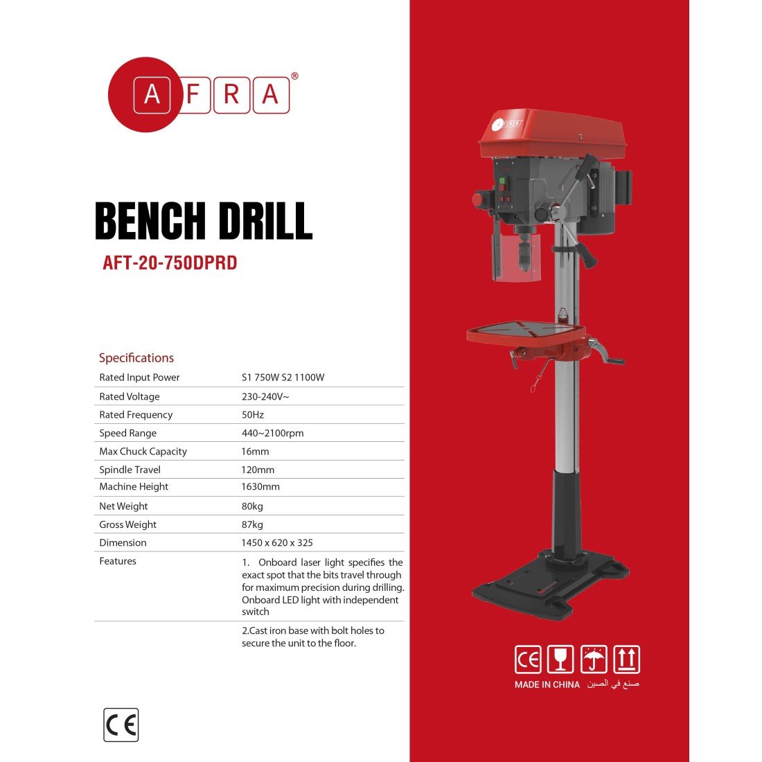 AFRA Drill Press – Model AFT-20-750DPRD is engineered for precision and stability in every project. Designed with a powerful 750W motor and variable speed range of 440 to 2100 RPM, this drill press delivers reliable results across wood, metal, and plastic.