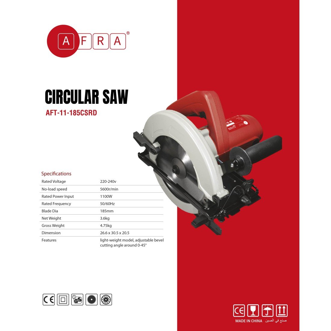 AFRA 1100W circular saw with 185mm blade, 5600 RPM speed, and adjustable 0–45° bevel angle.