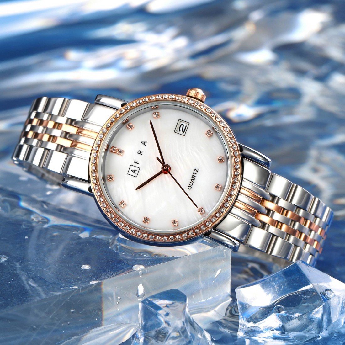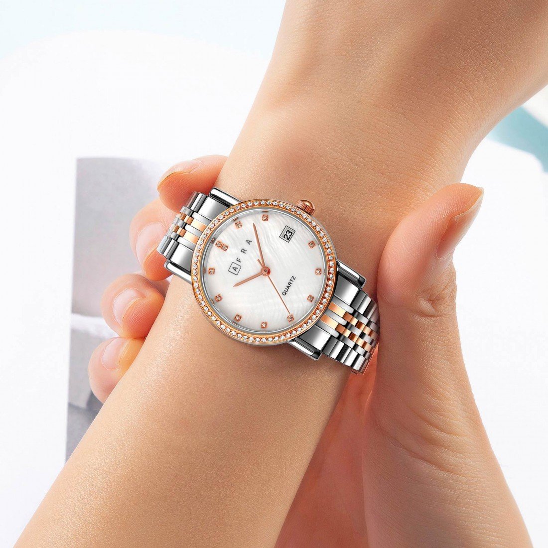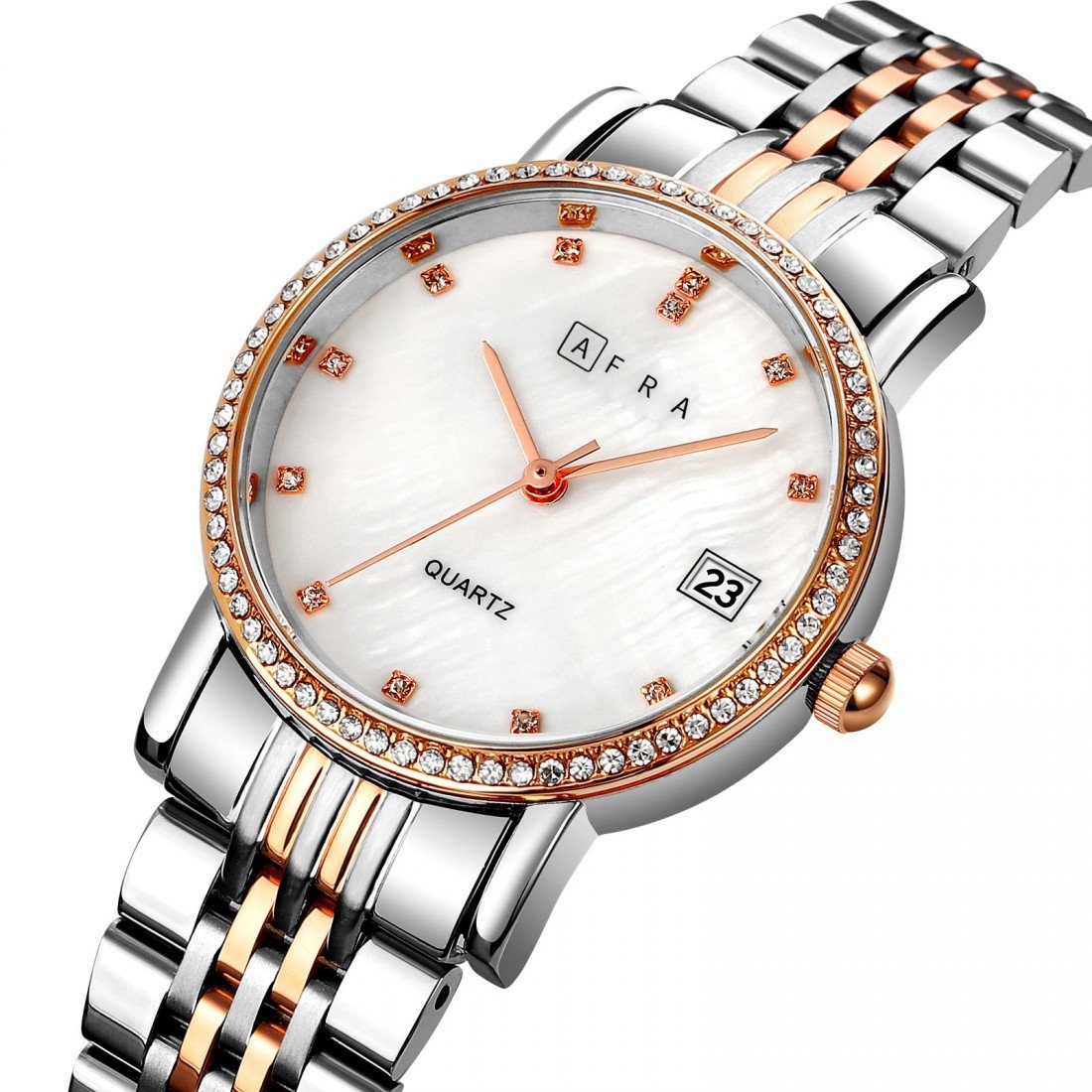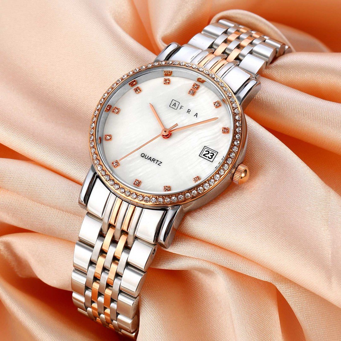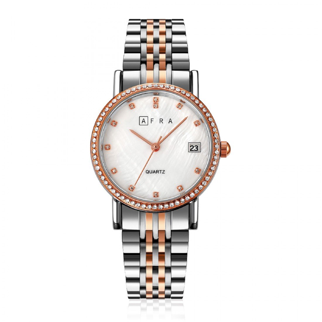The AFRA Calla Ladies Watch AF20603 is a refined expression of classic charm and contemporary style. It features a graceful rose gold and silver-tone case, paired with a luminous white mother-of-pearl (MOP) dial that adds an elegant touch to any look. The matching two-tone rose gold and silver bracelet ensures comfort and sophistication, making it suitable for both day and evening wear. With precise quartz movement and a lightweight, durable build, this timepiece is perfect for the modern woman seeking elegance, reliability, and versatility.