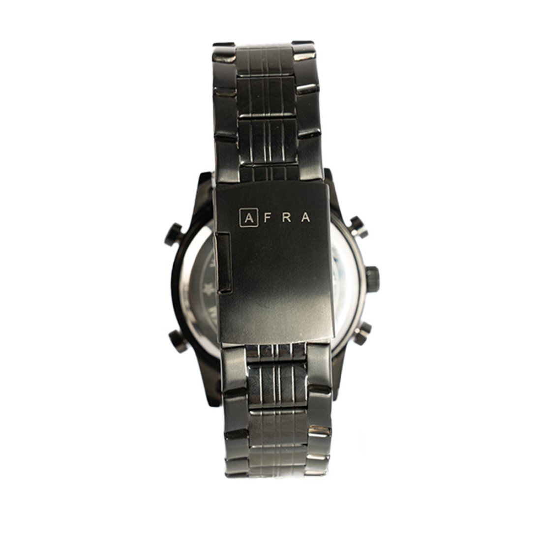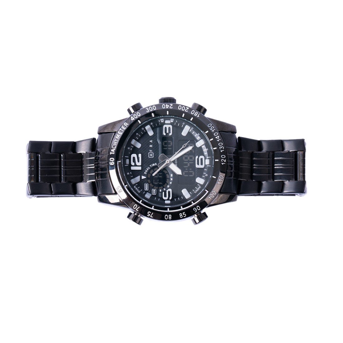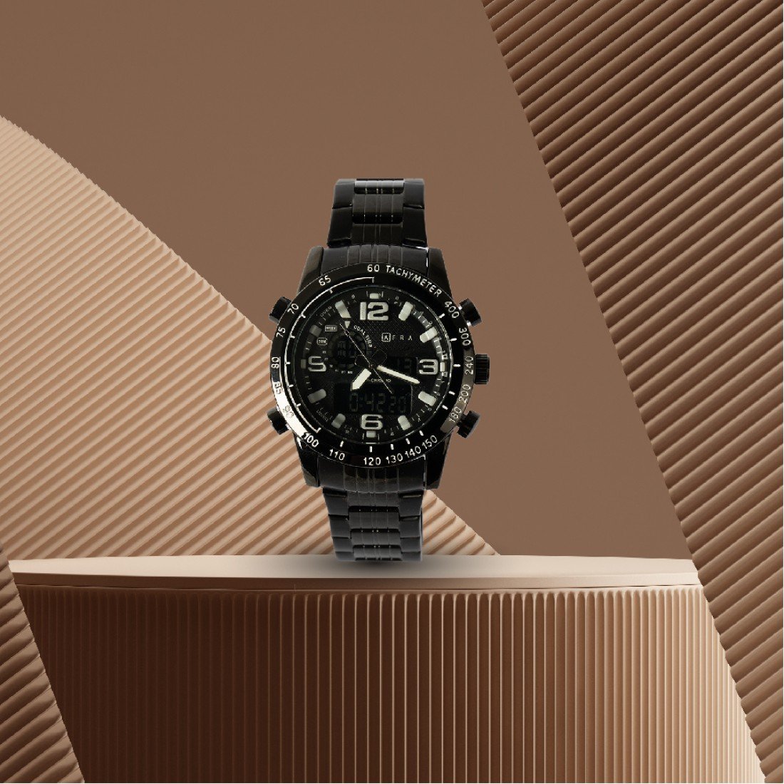 Bold and powerful, the AFRA Donovan Gents Watch AF12101 is designed to make a lasting impression. This all-black chronograph timepiece features a robust black case, matching black dial, and a sleek black metal bracelet that exudes strength and modern sophistication. Powered by a precise chronograph movement, it not only tracks time but adds sporty utility to your daily style. Built for men who embrace bold aesthetics and precision, the AF12101 is your perfect companion for both casual and formal occasions.