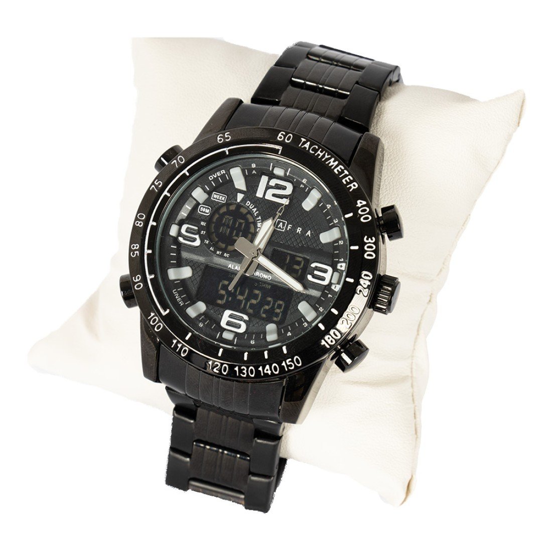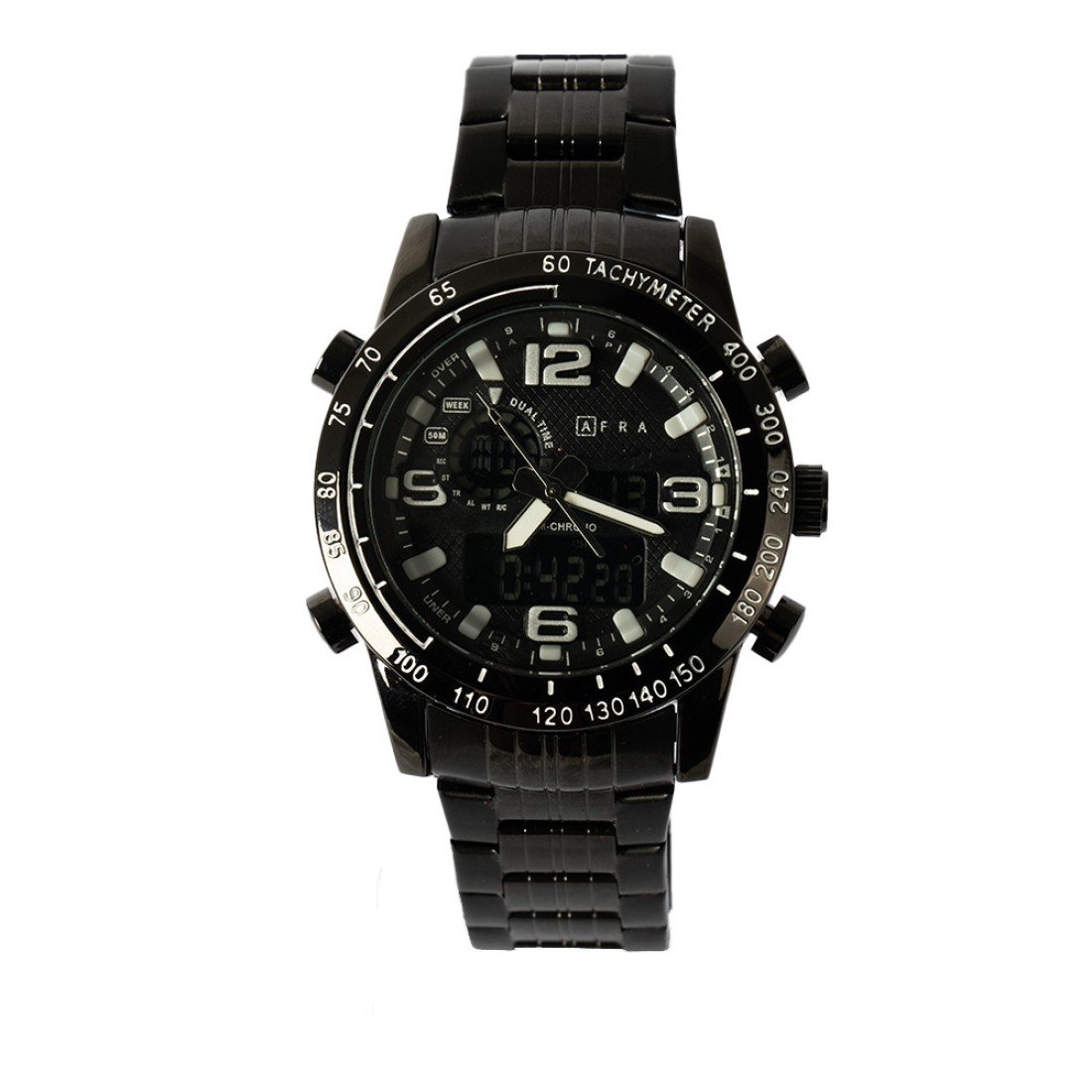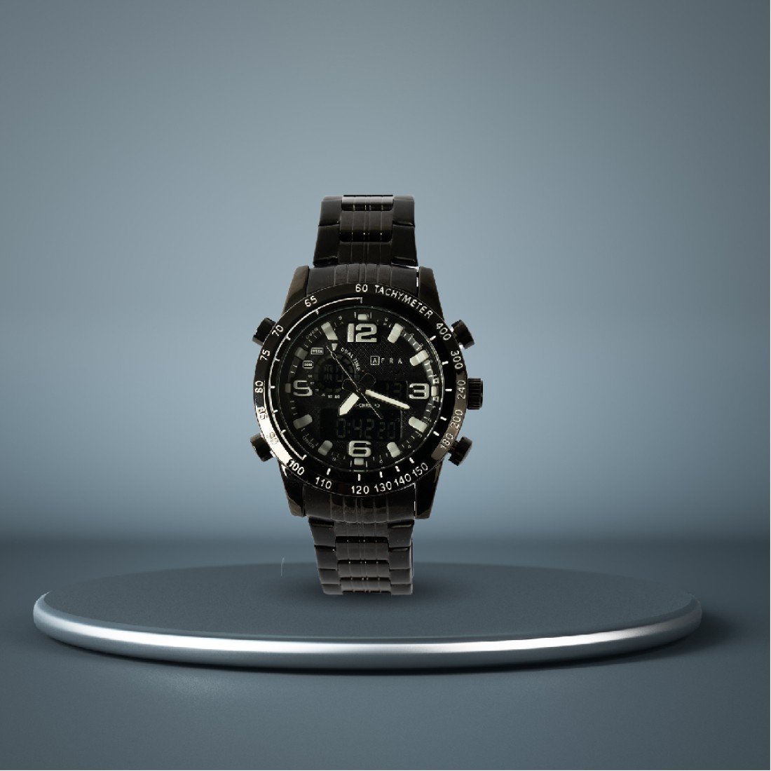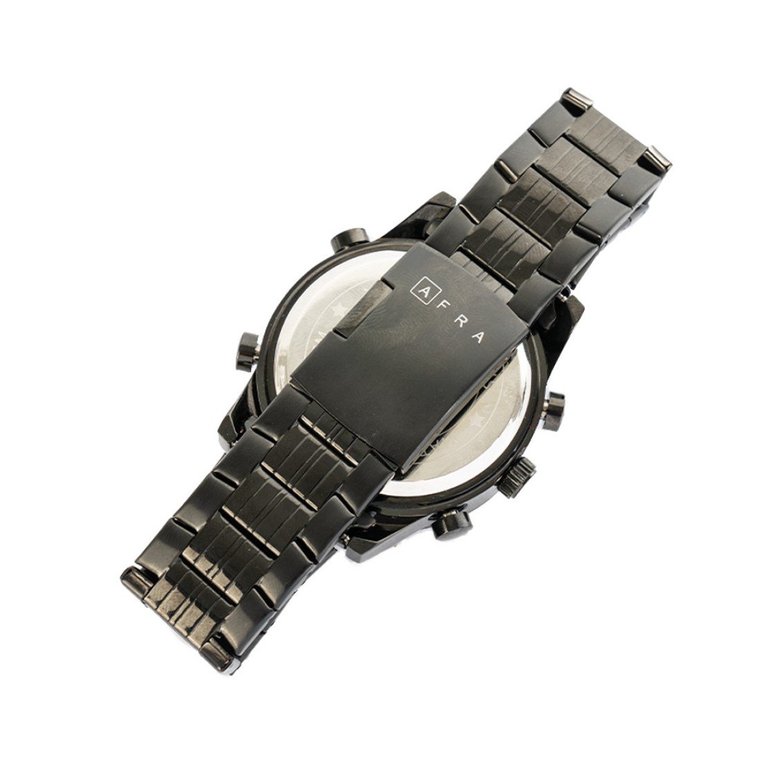 Bold and powerful, the AFRA Donovan Gents Watch AF12101 is designed to make a lasting impression. This all-black chronograph timepiece features a robust black case, matching black dial, and a sleek black metal bracelet that exudes strength and modern sophistication. Powered by a precise chronograph movement, it not only tracks time but adds sporty utility to your daily style. Built for men who embrace bold aesthetics and precision, the AF12101 is your perfect companion for both casual and formal occasions.