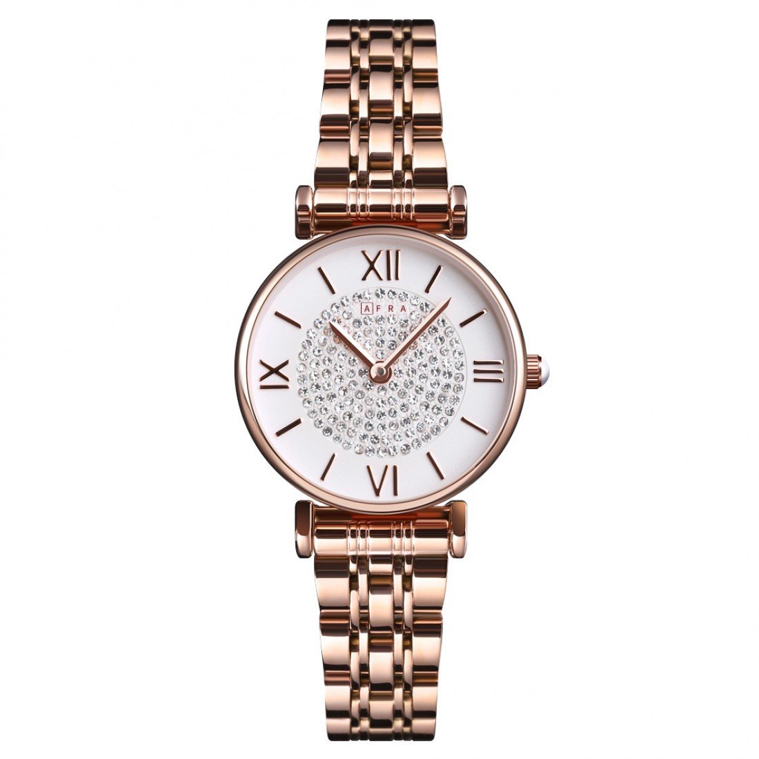 Elevate your wristwear with the AFRA Esme Ladies Watch AF21402, a timeless piece defined by its polished gold-tone case, clean white dial, and elegant gold bracelet. The perfect blend of sophistication and everyday wearability, this watch is powered by a precise quartz movement, offering dependable timekeeping. Lightweight and water resistant up to 30 meters, the AF21402 is ideal for both professional and formal settings, adding a radiant golden touch to your daily look.